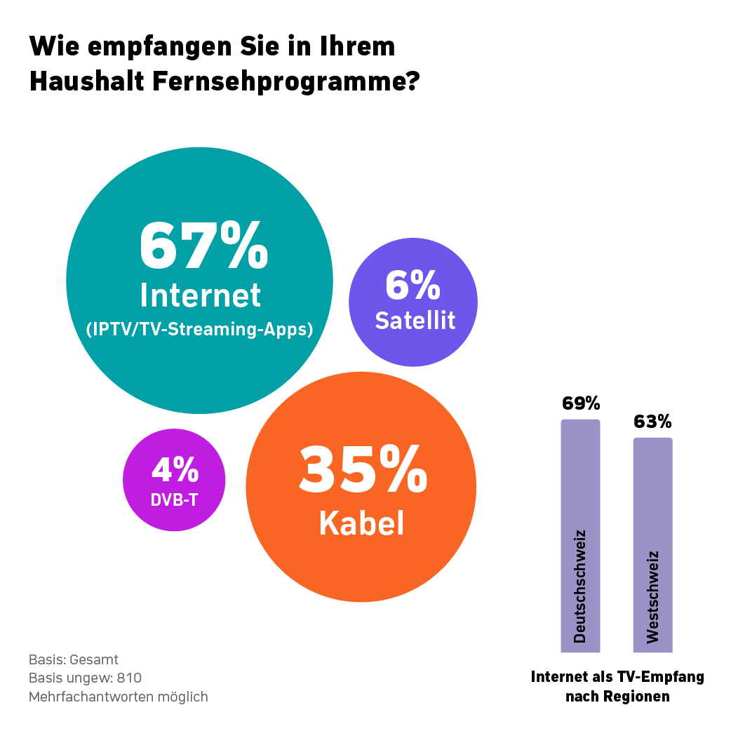Bedeutsam ist, dass in der Schweiz Live-TV-Inhalte beliebter sind als Video-on-Demand Angebote. In der Westschweiz liegt lineares Fernsehen mit 59 Prozent deutlich vor VoD-Inhalten, die gerade einmal auf 25 Prozent kommen. Dabei werden günstige Angebote präferiert und sind noch vor den kostenlosen Inhalten zu finden.