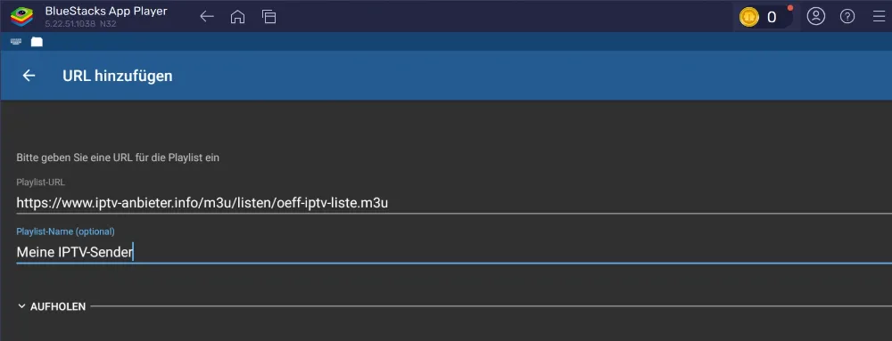 Wir haben zu diesem Zweck für Sie eine Testdatei mit etlichen öffentlich-rechtlichen Sendern hinterlegt oder verwenden ihre eigenen Listen! Um die Testdatei einzuspielen, klicken Sie in der App unten auf „Playlist hinzufügen“ und wählen dann „URL“ als Quelle.